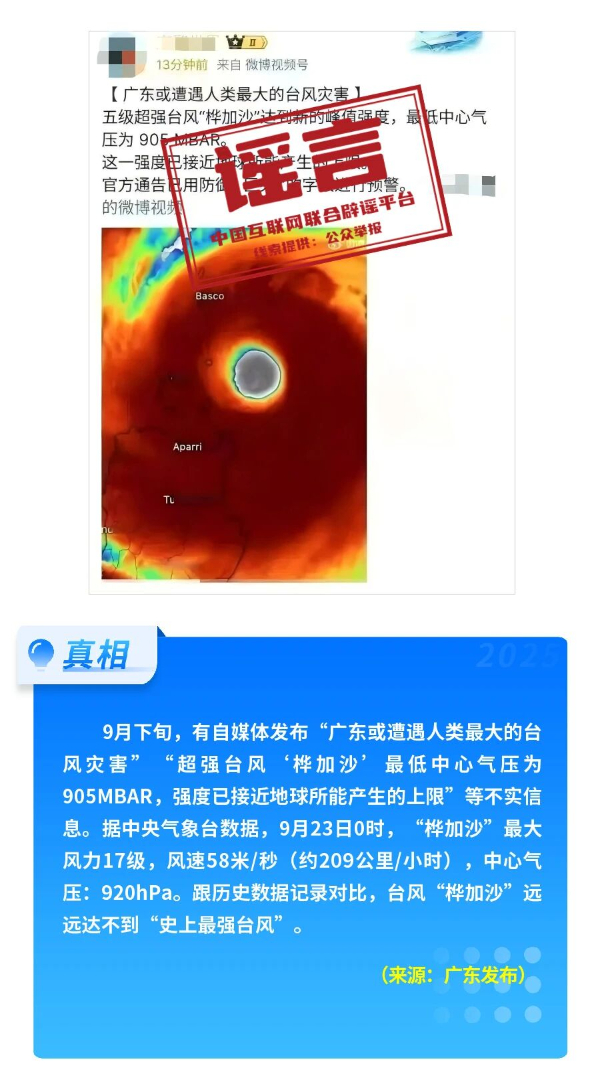 9月,涉汛、涉灾害类谣言多发。有自媒体发布“广东或遭遇人类最大台风灾害”的信息,夸大事实、制造恐慌,据中央气象台数据,“桦加沙”远远达不到“史上最强台风”等级。随着“桦加沙”台风逼近广东沿海地区,社交平台上出现多张所谓“深交所门前牛雕塑被拴”“车辆被五花大绑”的图片,均被证实系AI合成。河南发生区域性暴雨天气期间,多个账号发布“郑州9月16日遭大暴雨,比7.20还厉害”的内容,实为用AI技术拼凑、剪辑生成的虚假视频。
