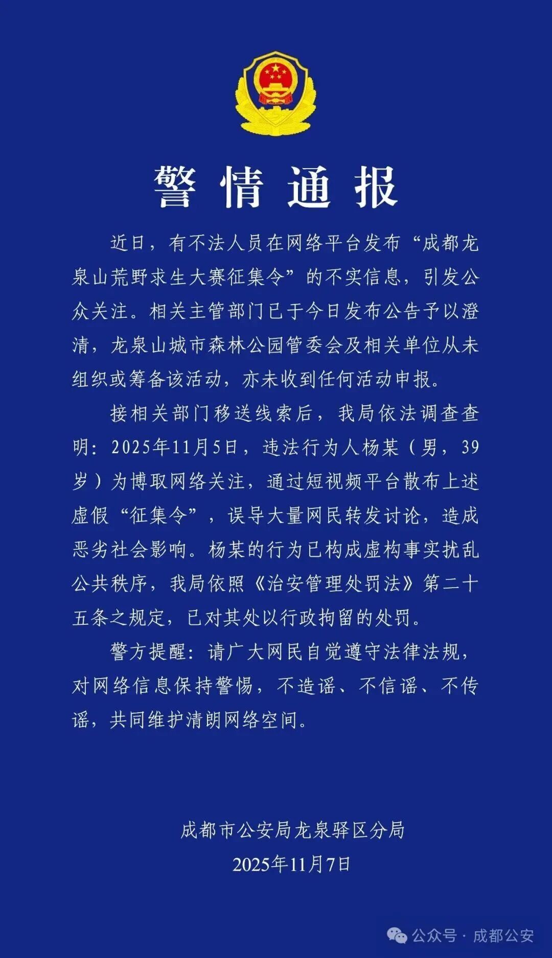 造谣“成都龙泉山荒野求生大赛征集令”博取关注,被行拘