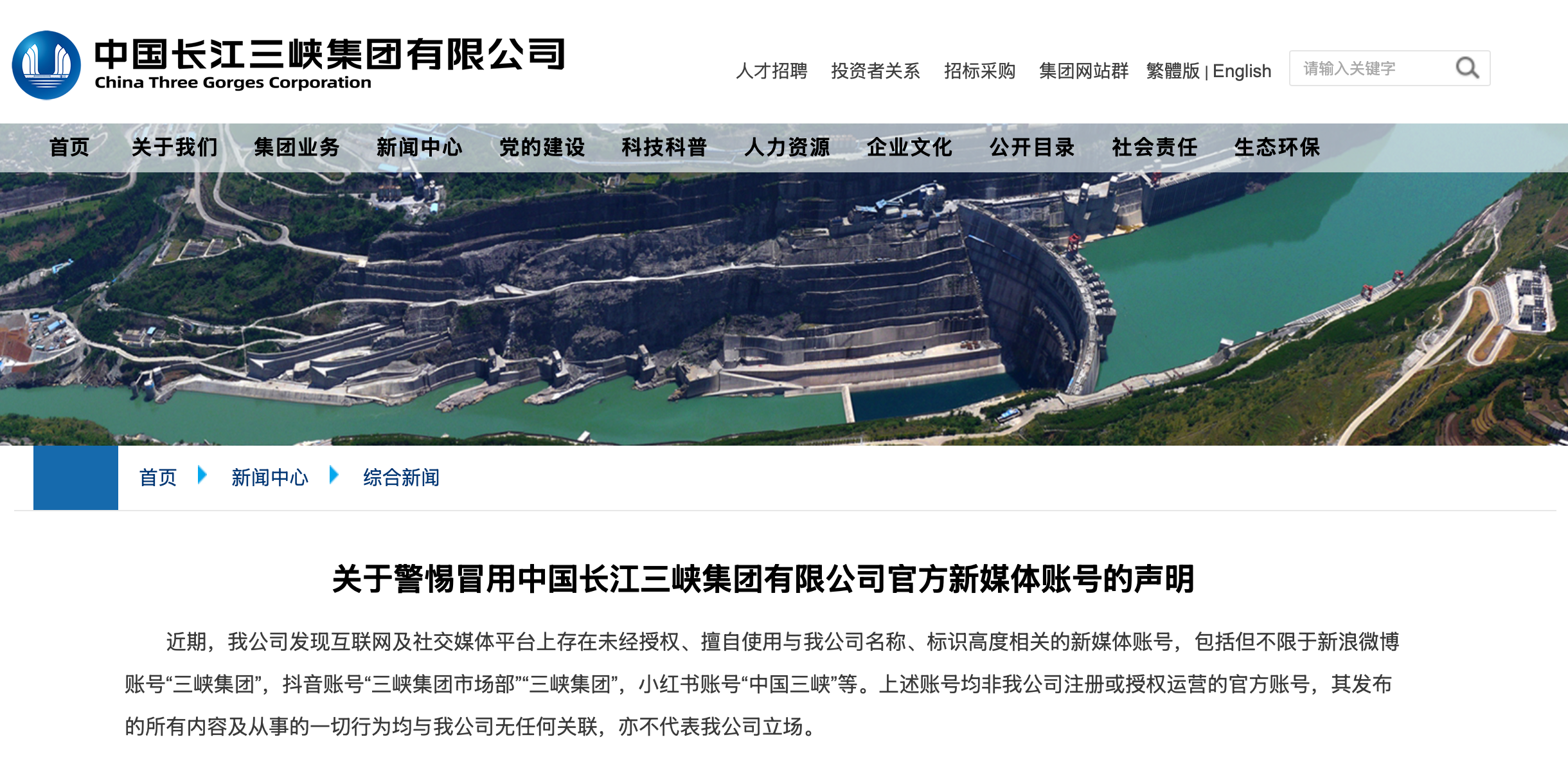 11月13日,中国长江三峡集团有限公司发布“关于警惕冒用中国长江三峡集团有限公司官方新媒体账号的声明”。