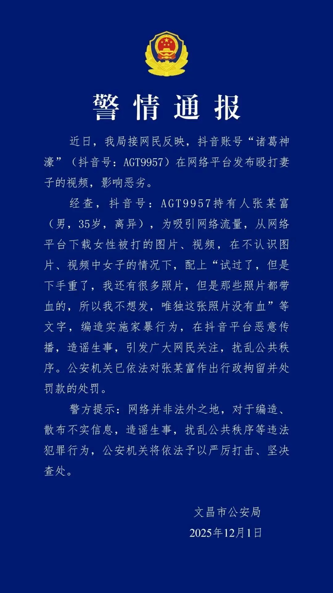 近日,文昌市公安局接网民反映,抖音账号“诸葛神濠”(抖音号:AGT9957)在网络平台发布殴打妻子的视频,影响恶劣。