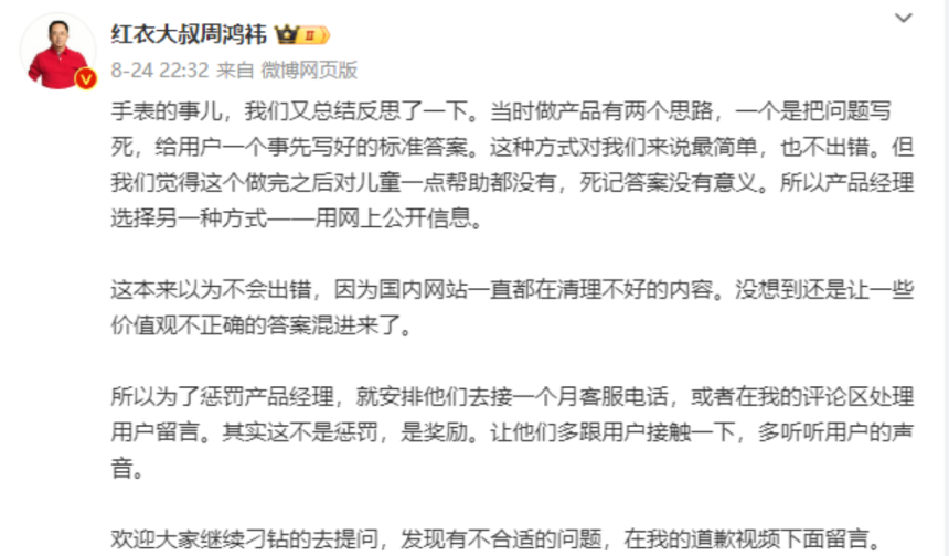 8月24日 周鸿祎再度回应称已“惩罚”产品经理去接一个月客服电话、处理用户留言,倾听用户声音。