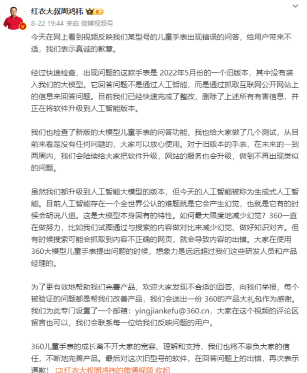 当晚 360集团董事长周鸿祎发长文回应此事。他表示此款手表系2022年5月的旧版本,尚未接入大模型,回答问题是基于互联网公开信息,后续将升级到人工智能版本。