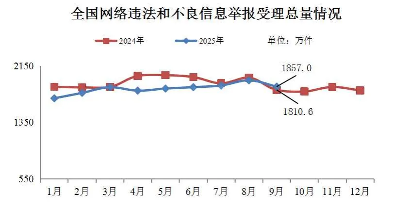 2025年9月,中央网信办举报中心指导全国各级网信举报工作部门、主要网站平台受理网民举报色情、赌博、侵权、谣言等违法和不良信息1857万件,环比下降4.6%、同比增长2.6%。其中,中央网信办举报中心受理举报39.4万件,环比下降7.4%、同比下降1.6%;各地网信举报工作部门受理举报100.8万件,环比增长58.8%、同比下降9%;全国主要网站平台受理举报1716.8万件,环比下降6.7%,同比增长3.4%。