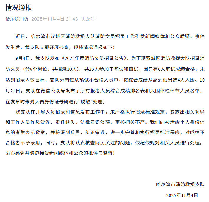 支队在开展人员招录和信息发布工作中,未严格执行招录标准规定,暴露出相关领导和工作人员作风漂浮、责任缺失,法律意识淡薄、审核把关不严。哈尔滨市消防救援支队向被泄露个人身份信息的考生表示歉意,并将深刻反思,纠正错误,进一步完善和执行招录标准程序,对成绩不合格者不予录用。同时,支队将认真核查网民关注的问题,依纪依规对相关人员进行处理。衷心感谢并诚恳接受新闻媒体和公众的批评与监督!