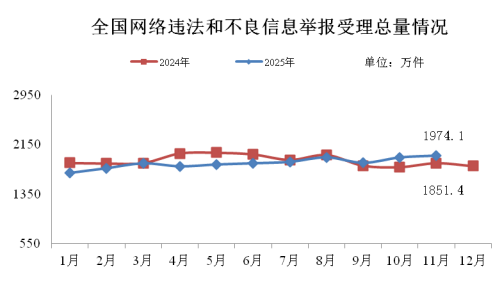 2025年11月,中央网信办举报中心指导全国各级网信举报工作部门、主要网站平台受理网民举报色情、赌博、侵权、谣言等违法和不良信息1974.1万件,环比增长1.5%、同比增长6.6%。其中,中央网信办举报中心受理举报49.9万件,环比增长39%、同比增长27.3%;各地网信举报工作部门受理举报70.8万件,环比下降46.2%、同比下降47.6%;全国主要网站平台受理举报1853.4万件,环比增长4.2%,同比增长10.5%。
