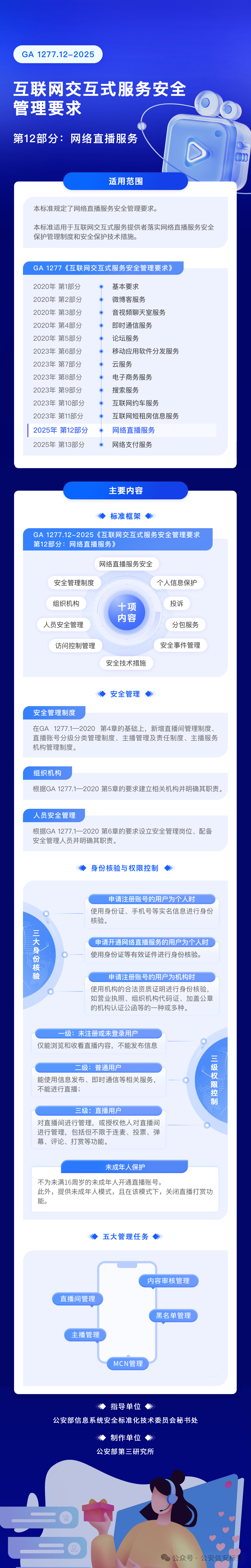 一图读懂 | 公共安全行业标准GA 1277.12-2025《互联网交互式服务安全管理要求 第12部分:网络直播服务》