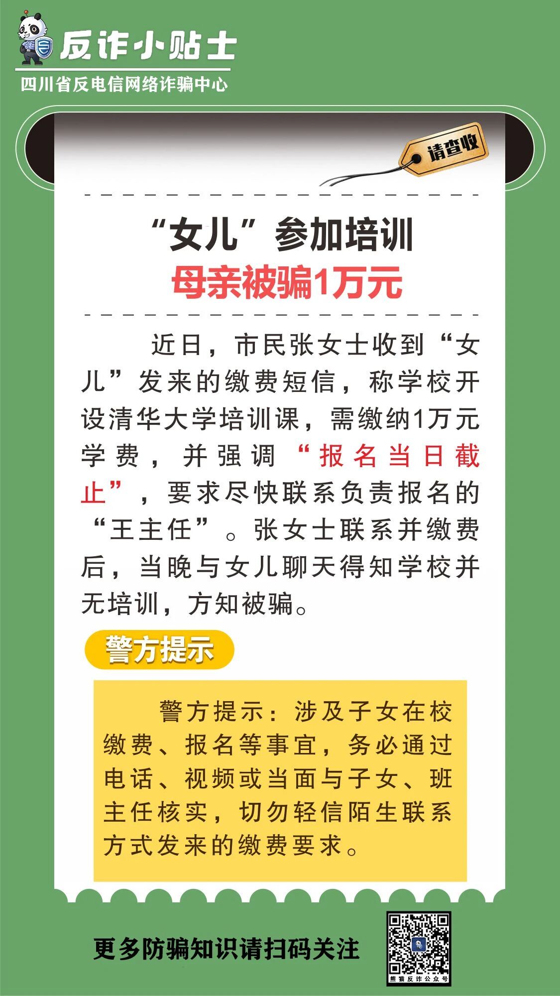 近日,市民张女士收到“女儿”发来的缴费短信,称学校开设清华大学培训课,需缴纳1万元学费,并强调“报名当日截止”,要求尽快联系负责报名的“王主任”。张女士联系并缴费后,当晚与女儿聊天得知学校并无培训,方知被骗。