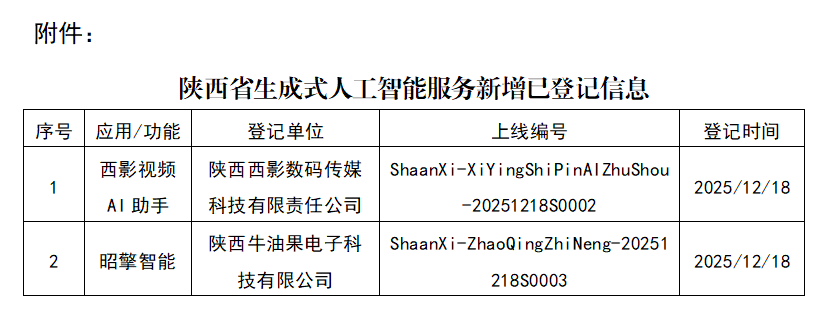 截至2025年12月23日,我省新增2款已完成登记的生成式人工智能服务,累计已完成3款生成式人工智能服务登记,现将我省新增已登记信息予以公告。