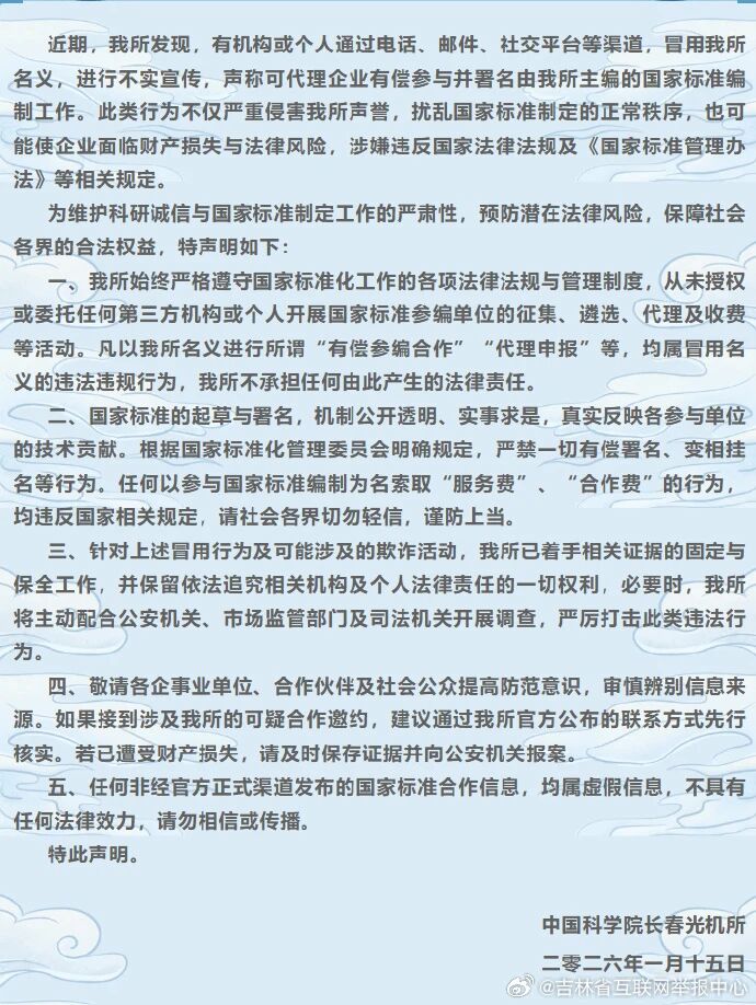 近期,有机构或个人冒用中国科学院长春光机所名义,开展有偿代理国家标准编制署名的不实宣传。对此,长春光机所发布《郑重声明》,从未授权或委托任何第三方机构或个人开展国家标准参编单位的征集、遴选、代理及收费等活动;任何以参与国家标准编制为名索取“服务费”“合作费”的行为,均违反国家相关规定。目前已着手相关证据的固定与保全工作,并保留依法追究相关机构及个人法律责任的一切权利。提醒社会公众提高防范意识,审慎辨别信息来源。任何非经官方正式渠道发布的国家标准合作信息,均属虚假信息。