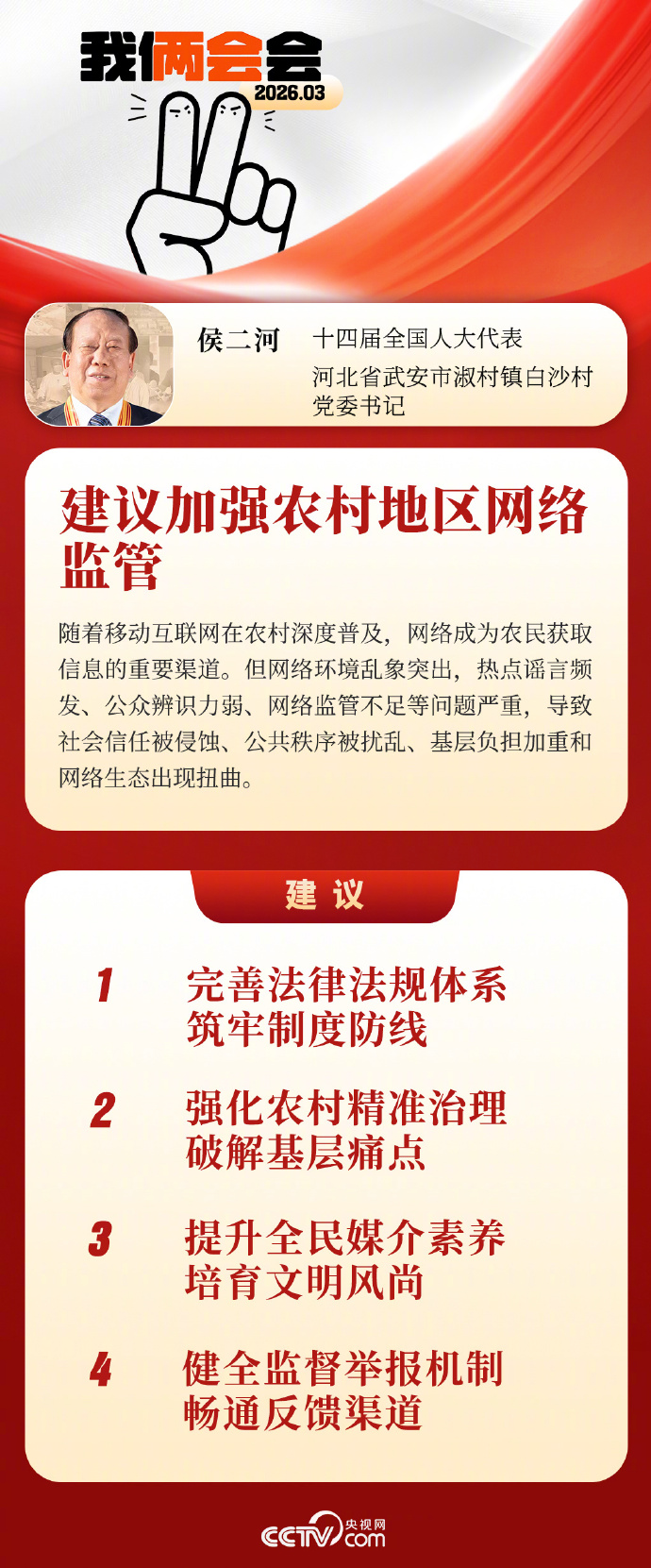 全国人大代表、河北省武安市淑村镇白沙村党委书记侯二河建议,通过完善法律法规、强化精准治理、提升全民媒介素养、健全监督机制等措施加强农村网络监管,改善网络生态。