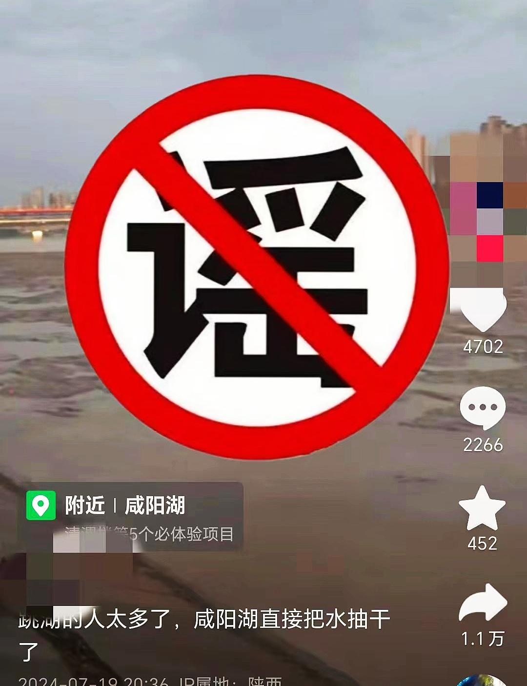 2024年7月22日,陕西咸阳秦都公安网警在网上巡查时发现有网民在抖音平台发布视频并配文称“跳湖的人太多,咸阳湖直接把水抽干了”,该信息被大量转发,引发公众热议。