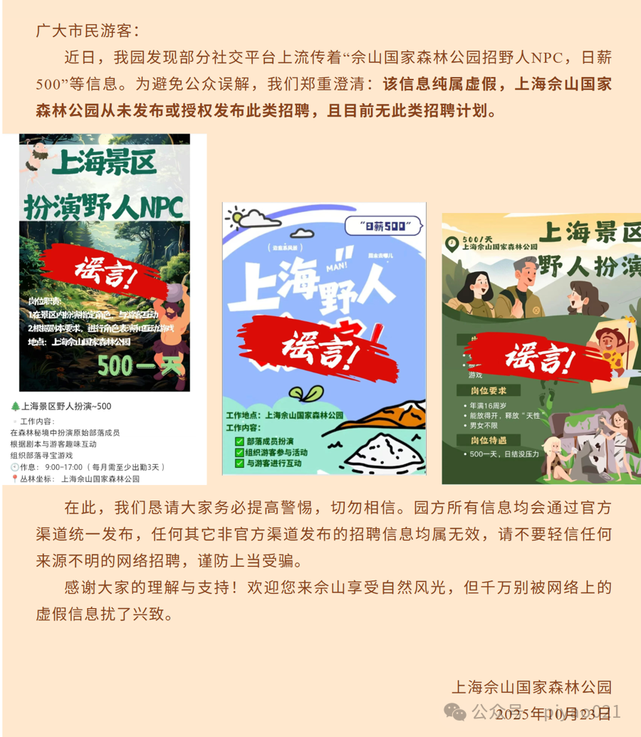 10月23日,上海佘山国家森林公园通过官方微信号发布辟谣声明,表示从未发布或授权发布招募“野人NPC(非玩家角色)”的招聘,而且目前无此类招聘计划,提醒公众提高警惕。
