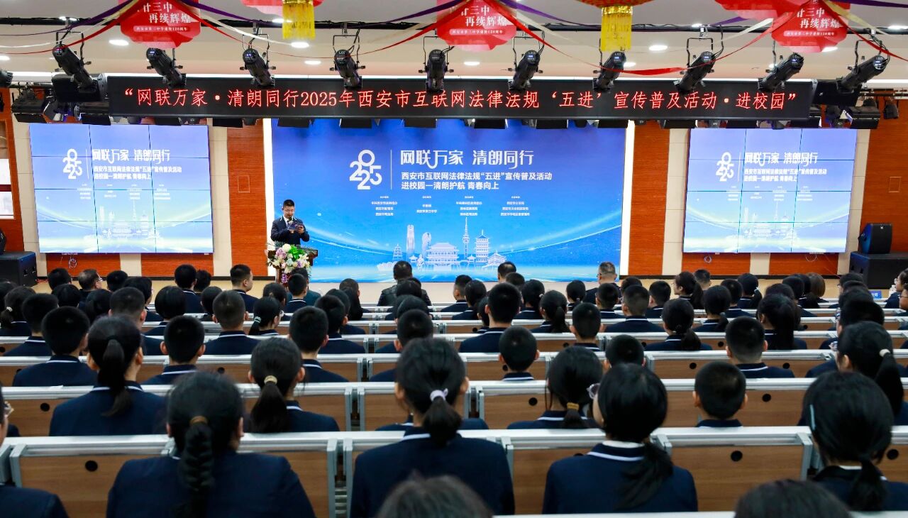 为深入做好网络普法工作,努力提升青少年网络法治意识,规范上网用网行为。10月27日,由陕西省西安市委网信办、市教育局、市司法局主办,碑林区委网信办、区教育局、区司法局协办,华商网、西安市第三中学承办的“网联万家·清朗同行2025年西安市互联网法律法规‘五进’·进校园-清朗护航 青春向上”活动走进西安市第三中学,为师生们带来一场生动的法治教育“实践课”。此次活动获得了市公安局、市文化和旅游局、市市场监督管理局等部门的大力支持。