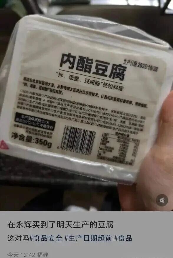 10月27日,福建泉州一名消费者发文称,在永辉超市购买到一盒内酯豆腐,其包装上标注的生产日期竟是“2025年10月28日”——也就是“明天”。这盒“穿越豆腐”迅速引发关注,网友调侃其为“穿越豆腐”。