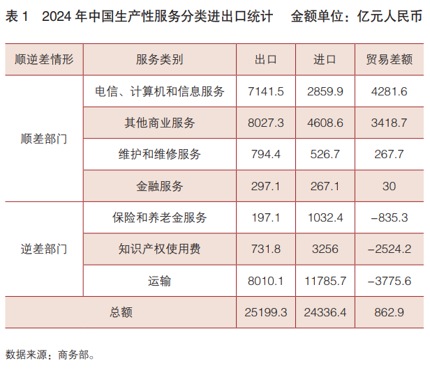 根据商务部数据,2017—2024年,我国生产性服务出口占总服务出口的比例由64%上升至79%;服务贸易逆差由16177.4亿元收窄至11726.7亿元,但数额仍然较大;相比之下,生产性服务贸易发展迅猛,同期生产性服务贸易差额由-3580.6亿元升至862.9亿元,由逆差转为顺差。这主要归因于电信、计算机和信息服务贸易顺差由580.3亿元升至4281.6亿元,其他商业服务贸易顺差由1262.1亿元扩大至3418.7亿元(见表1)。