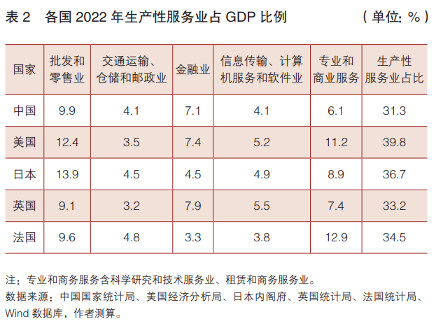 从规模看,2022年,我国生产性服务业增加值为5.7万亿美元,相当于美国生产性服务业规模的55%。从占比看,2022年,我国生产性服务业增加值占GDP比例为31.3%,同期美国为39.8%,日本、英国、法国分别为36.7%、33.2%、34.5%。从历史看,2000—2022年,美国生产性服务业占比每年都保持在35%以上,日本保持在33%以上,英国、法国均保持在31%以上,并且稳步提升。我国生产性服务业仍有很大发展空间。