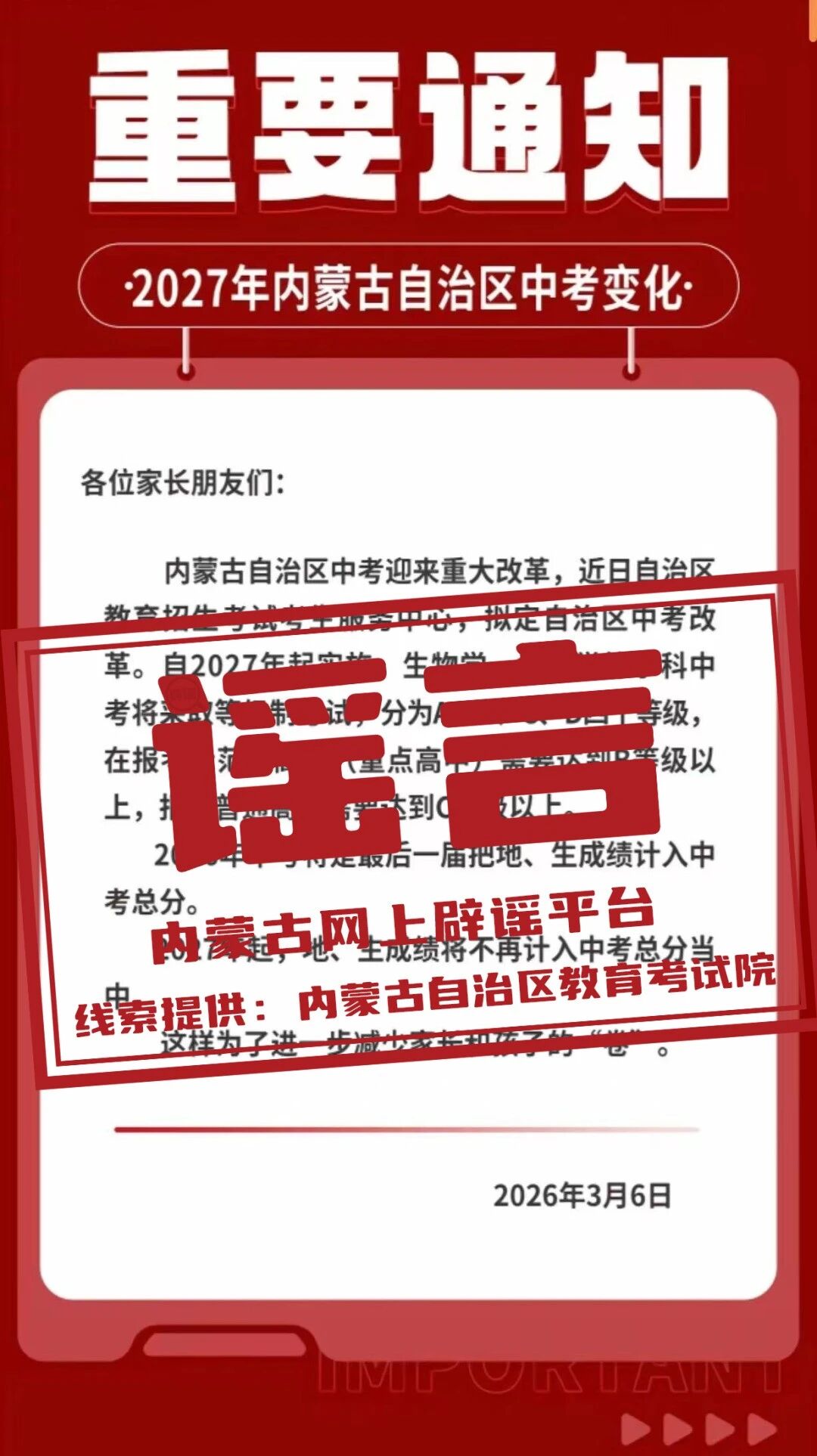针对此谣言,内蒙古自治区教育考试院已于3月10日发布官方辟谣声明,明确指出以上信息均不属实,并提醒广大考生和家长从官方渠道获取权威信息,不信谣、不传谣。