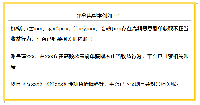 1.通过人工方式或技术手段规避平台风控规则,恶意刷单、刷量、刷粉,获取不正当流量、收益等行为2.扰乱平台计费结算秩序的行为:利用非法手段规避平台安全策略,套取平台激励、扰乱平台计费结算秩序的行为3.发布色情、低俗、盗版等不符合平台生态规范的行为