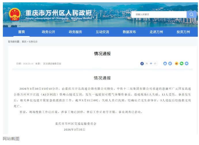 3月30日15时10分许,由重庆万开达高速公路有限公司投资、中铁十二局集团有限公司承建的恩施至广元国家高速公路万州至开江段(A2合同段)铁峰山隧道左洞,发生一起疑似可燃气体爆炸事故,造成现场1人失联、12人受伤。事故发生后,相关单位迅速开展紧急救援救治工作。截至3月31日0时,失联人员已找到、经确认已无生命体征,3人送医后经抢救无效死亡。
