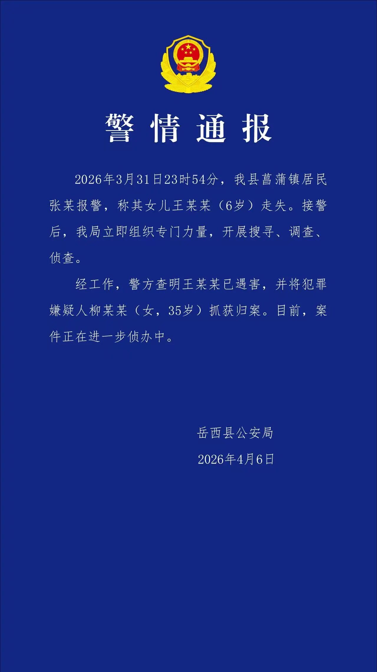 4月6日,安徽岳西县公安局就“安徽6岁女童失联”发布《警情通报》:该女童已遇害,犯罪嫌疑人柳某某已被抓获归案。