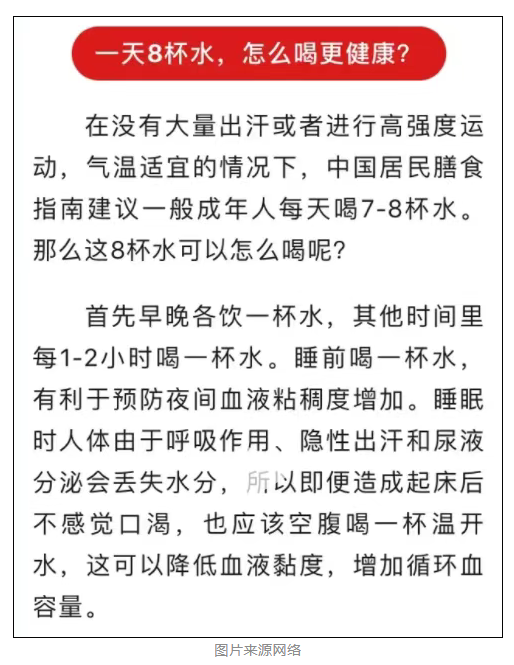 相信很多不爱喝水的人都被爸妈教育过:“一天要喝 8 杯水!”一天喝 8 杯水的说法已经流传了太长时间,导致很多人现在提起喝水,第一反应就是喝 8 杯。还有很多账号说这是居民膳食指南推荐的。